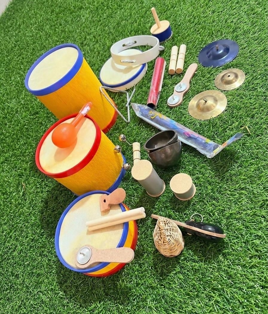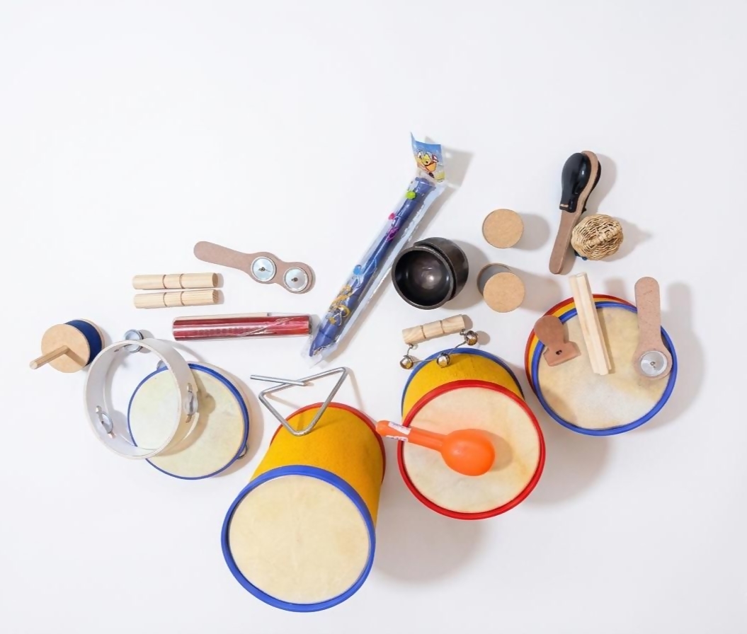 A introdução de instrumentos musicais na rotina infantil traz benefícios que acompanham a criança por toda a vida: Desenvolvimento Cognitivo: Estimula a concentração, a memória e o raciocínio lógico. Coordenação Motora: Ao tocar tambores, chocalhos ou o triângulo, a criança aprimora o controle dos movimentos finos e amplos. Expressão Emocional: A música é uma linguagem. Ela ajuda os pequenos a expressarem sentimentos e a liberarem a criatividade de forma saudável. Percepção Auditiva: Diferenciar sons graves, agudos e ritmos variados aguça a audição e a sensibilidade sonora. A partir dos 3 anos com supervisão de adulto. Material feito à mão.