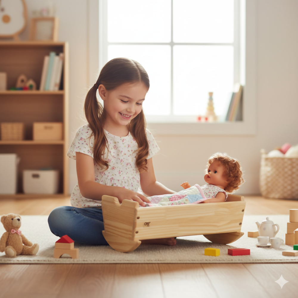 "É um tesouro! Feito em madeira de reflorestamento, este bercinho não é apenas um brinquedo, é a herança de memórias que passa de geração para geração, resistente como o afeto verdadeiro." O lúdico é a linguagem da infância. Brincar de cuidar é muito mais que diversão, é um exercício de desenvolvimento emocional e social. - A sua história de carinho começa aqui!