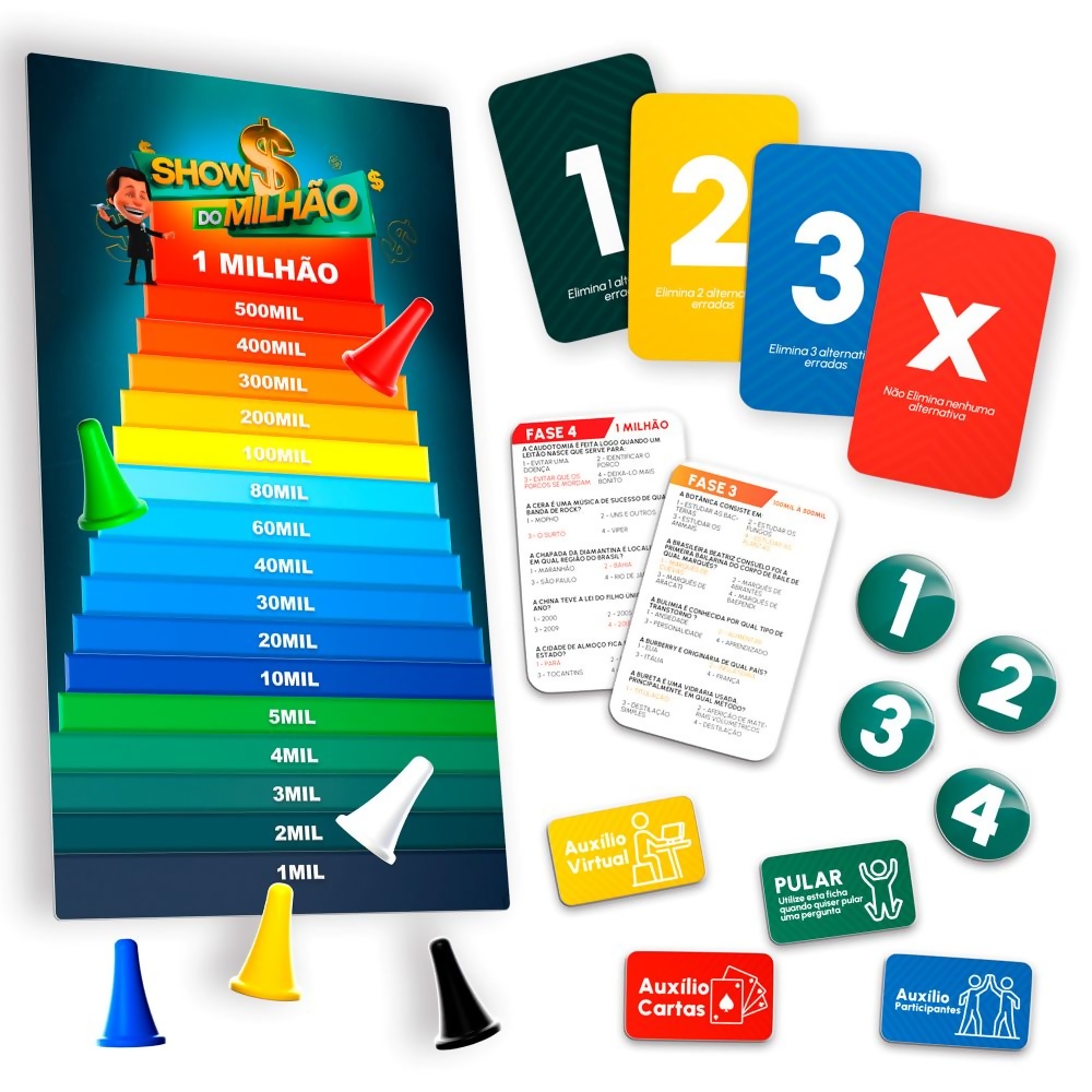 O JOGO SHOW DO MILHÃO traz toda a ADRENALINA e o brilho dos estúdios de televisão direto para a sua família. Com mais de 800 perguntas desafiadoras, prepare-se para testar seus conhecimentos e descobrir quem é o verdadeiro gênio da casa!