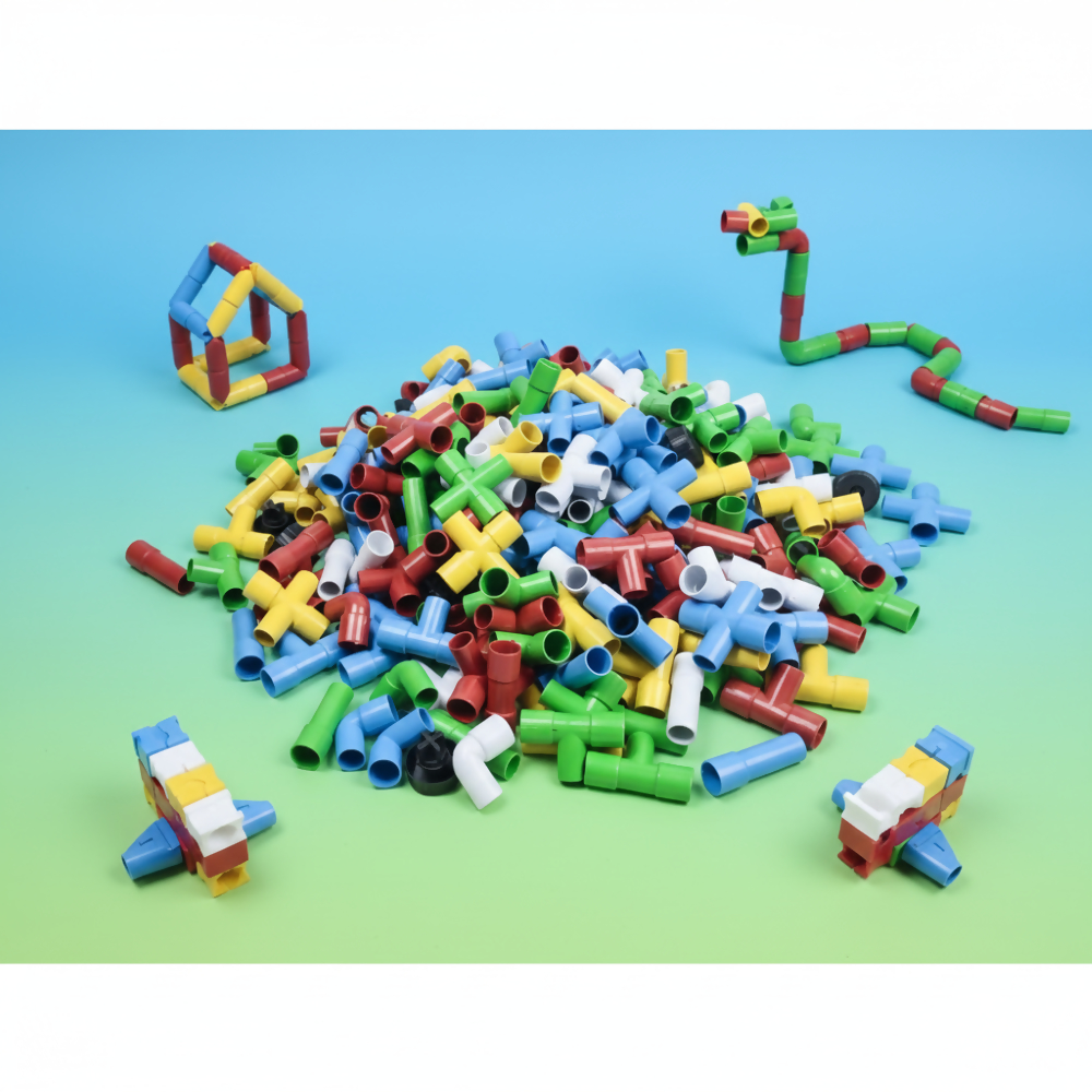 O kit de montagem que transforma tubos e conectores coloridos em qualquer coisa que a imaginação permitir! De castelos a robôs, de animais a formas geométricas, as possibilidades são infinitas.